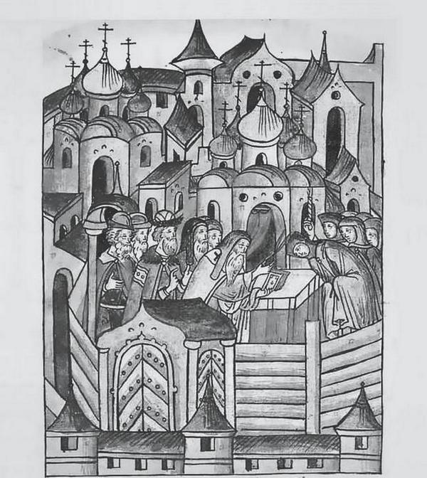 Пострижение Соломонии. Миниатюра Лицевого летописного свода