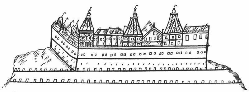 Дворец Лжедмитрия I на взрубе. Рисунок Исаака Массы. 1610