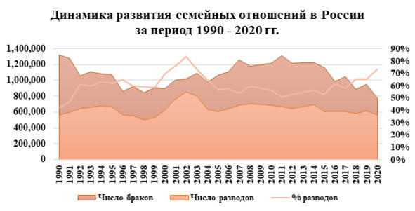 Рисунок 2. Динамика развития семейных отношений в России за период 19902020 гг.