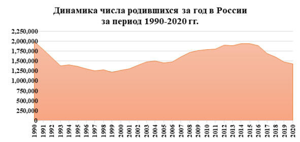 Рисунок 1. Динамика числа родившихся за год в России за период 19902020 гг.