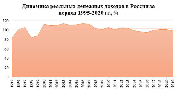 Рисунок 3. Динамика реальных денежных доходов в России за период 19952020 гг., %