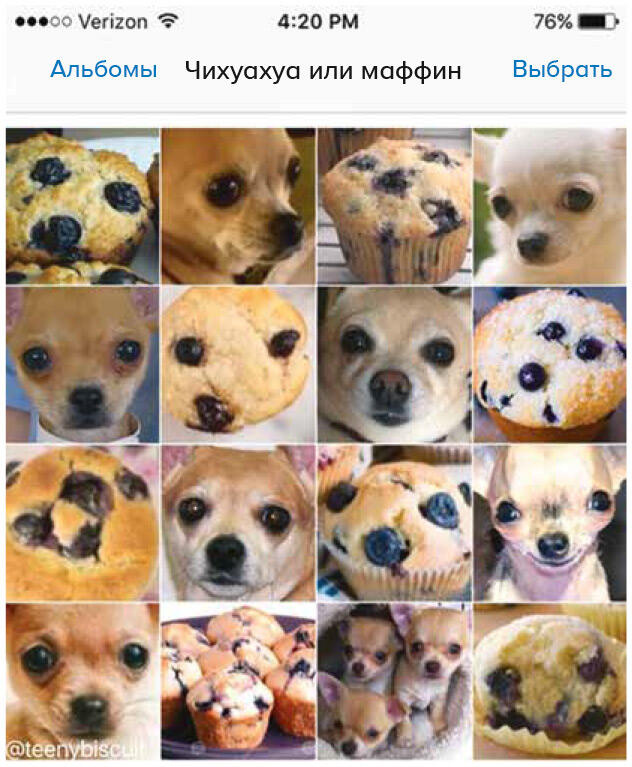 На подсознательном уровне мозг аккумулирует ментальные образы яркости, форм, линий, их направлений, цвета, движения, объектов и пространства (в дополнение к звукам, чувствам и проприоцепции[2]) в единый пользовательский опыт. Вы не осознаете эти ментальные образы по отдельности, равно как и не контролируете процесс их связывания в единый опыт или влияние воспоминаний на восприятие в настоящем и на возникновение тех или иных эмоций. Это важный вывод. Невероятно сложно создать машину, способную в автоматическом режиме выявлять ключевые различия между объектами, имеющими одинаковый цвет и форму например, между маффинами и чихуахуа, хотя человек выявляет эти различия моментально и безошибочно (рис. 2.2).