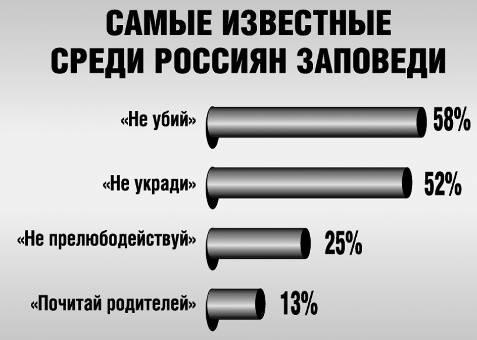 Как показал опрос наших сограждан, почти половина россиян не знает заповедей «не убий» и «не укради», остальные известны еще меньше. Треть россиян не могут вспомнить или не знают ни одной из десяти библейских Заповедей, выяснили социологи.