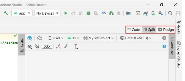 1) Code означает, что на экране можно видеть только xml разметку, то есть код, который описывает вид и расположение полей, кнопок и прочего.