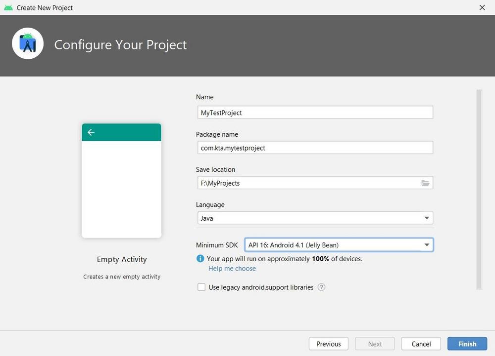 Язык программирования (Language) выбираем Java, а Minimum SDK выбираем такой, чтобы наше приложение поддерживалось на 100% устройств.