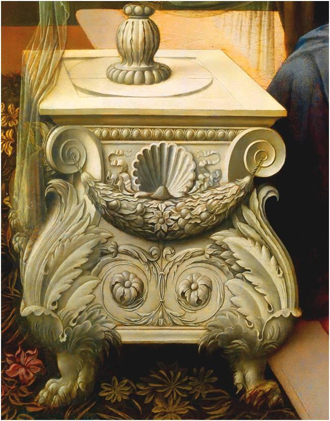 Боковая стенка под свисающей тканью написана очень подробно, словно в 3Д; становится понятно, что на всех четырех сторонах орнамент и узоры одинаковы. (При оцифровке «аура» вдоль колена левой ножки столика при наложении фрагмента на картину сохраняется, но, как и водится, при этом меняется фактура предметов: ткани грубеют, а дерево и камень превращаются в пластмассу.)