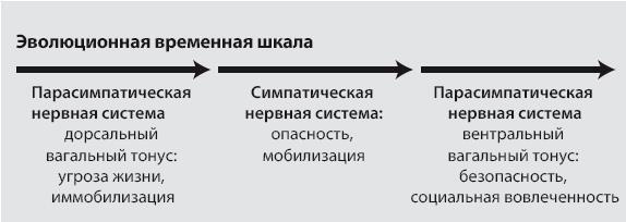 Поведение, связанное с этими состояниями, отражает парасимпатический и симпатический компоненты вегетативной нервной системы (ВНС). Хорошо модулируемые парасимпатическая (ПНС) и симпатическая нервные системы (СНС) работают вместе как в центральной нервной системе, так и на периферии, чтобы регулировать наши телесные функции. Ни одна из них не хороша и не плоха; нам нужны оба компонента для выживания и стремления к успеху. ПНС работает через многочисленные ветви 10-го черепного нерва (его называют блуждающим нервом или вагусом). Порджес придумал термин «поливагальная теория», чтобы описать роль блуждающего нерва с его двумя компонентами примитивным дорсальным (спинным) компонентом и умным вентральным (брюшным). Каждый компонент имеет свое начало в стволе мозга.
