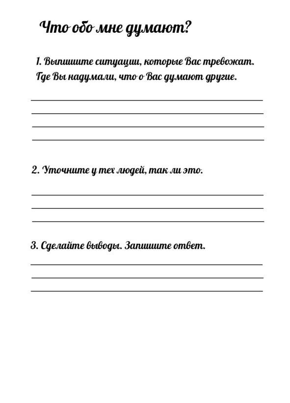1. Выписать на листок бумаги ситуации, которые Вас тревожат. Где Вы надумали про то, что думают другие.