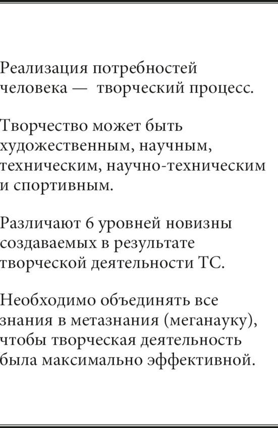 Реализация потребностей человека сначала может осуществляться и в рамках репродуктивной деятельности (воспроизводства уже известного), то есть практически без каких-либо элементов творчества. Но затем эта деятельность, как правило, превращается в творческий процесс по созданию технических систем (ТС) для удовлетворения тех же потребностей, но в новом качестве.