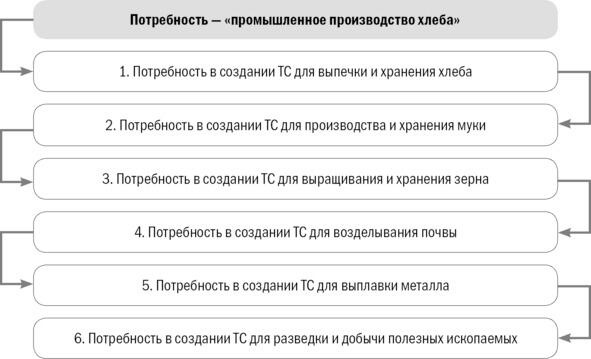 Следует отметить, что нередко для реализации конкретной потребности необходимо последовательно реализовать множество других потребностей. Например, потребность в промышленном производстве хлеба вызывает необходимость в реализации следующих новых потребностей по созданию ТС (рис. 7).