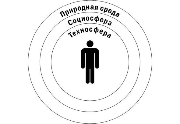 Жизнь человека протекает в сложной и непрерывно меняющейся окружающей среде, которую можно представить в виде упрощенной модели, отражающей совокупность взаимодействующих основных сред (сфер): природной среды, производственной среды (техносферы), социосферы (рис. 8).