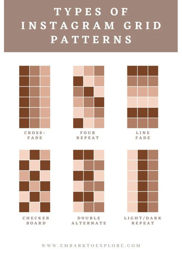 Пользуйтесь правилами раскладки постов. Сайт https://kalexandrah.com/ нам дает следующие типы сетки: плавное затихание, четыре повторения, исчезающая линия, шахматная доска, двойное чередование и светлый/темный повтор.