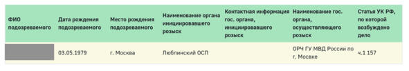 В результатах поиска будут указаны дата и место рождения, инициирующий розыск орган, статья УК РФ, по которой возбуждено уголовное дело (рис. 8).