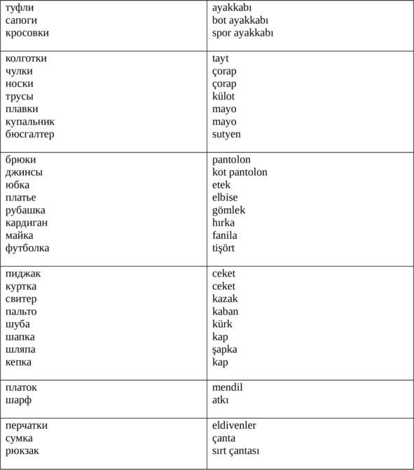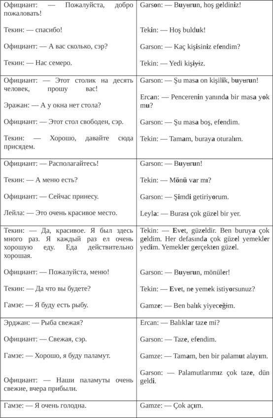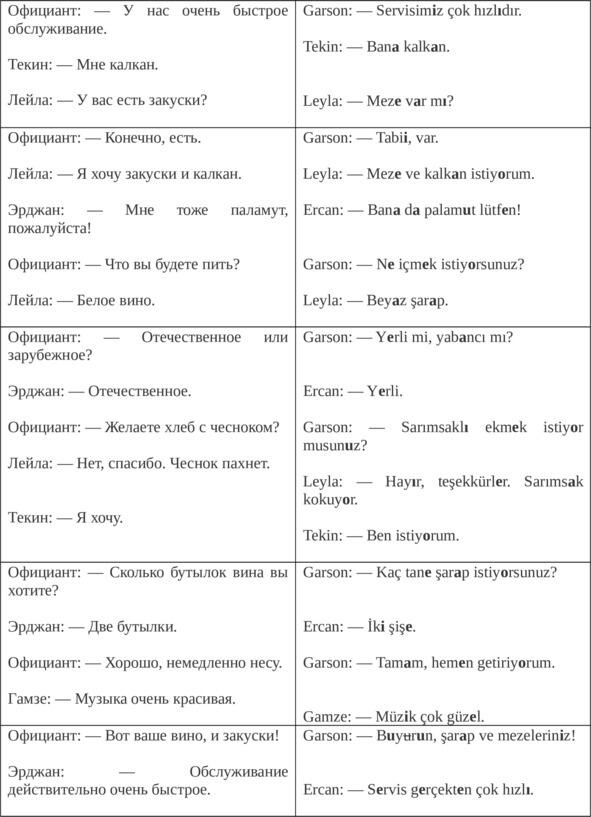 Выпишите и выучите все новые слова. Закройте турецкий текст, и переведите с русского на турецкий реплики из левой колонки таблицы, данной ниже. Если какие-либо слова вызовут у вас сложности, ещё раз выпишите их в словарь и выучите заново.