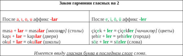 Аффикс (окончание) -lar прибавляется, если последний слог незаимствованного (исконно турецкого слова) содержит гласные a, ı, o, u, например: