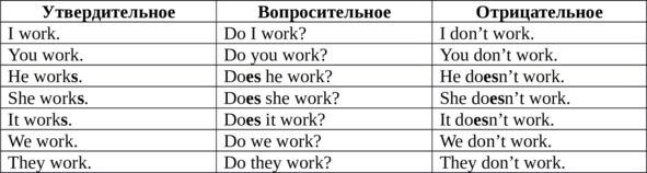 Present Simple по форме совпадает с инфинитивом1 глагола (без частицы to) во всех лицах, кроме 3-го лица единственного числа, принимающего окончание -s (-es).