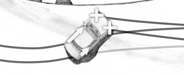 Таким образом, одновременно нажатые педали газа и тормоза на заднеприводной машине создают недостаточную поворачиваемость и позволяют выйти из заноса. В дальнейшем такой способ борьбы с заносом на заднеприводном автомобиле будем называть контраварийным приёмом «газ+тормоз». Как правило, при угле заноса примерно 45 градусов (угол нужно проверять для каждой машины) и больше приём «газ+тормоз» не срабатывает, поскольку тяга на заднем загруженном колесе заставляет автомобиль развернуться.