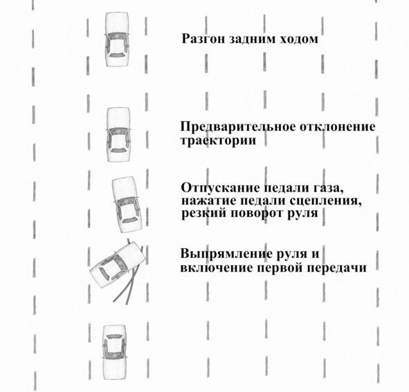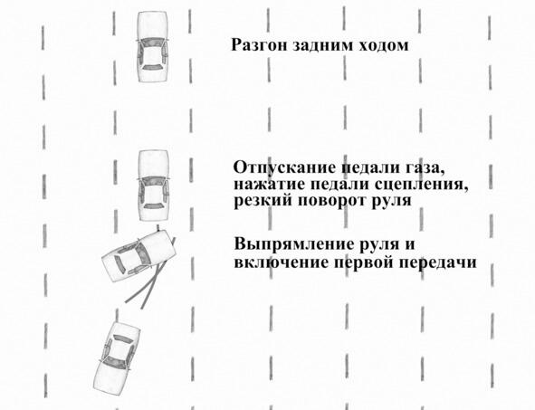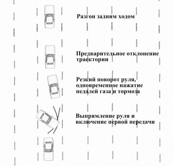 Несмотря на кажущуюся со стороны сложность приём довольно простой для исполнения. Рассмотрим выполнение приёма на переднеприводном и заднеприводном автомобилях.