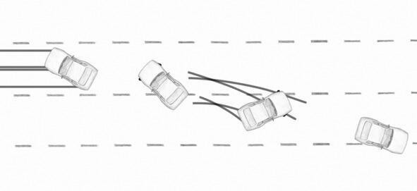 Как видим, после поворота руля машина начала медленно разворачиваться. Траектория движения немного искривилась. Следы от шин прервались, так как небольшую дистанцию машина двигалась почти задним ходом. Поворот руля позволил не только развернуться, но и искривить траекторию против направления заноса. Аналогичное искривление траектории мы наблюдали, когда выполняли полицейский разворот (преломление траектории было нежелательным, мы старались его исключить при помощи предварительного смещения).