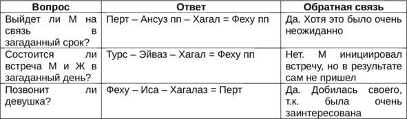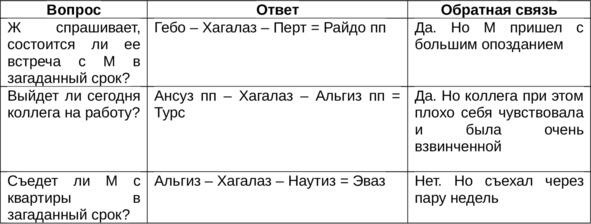 Много лет назад на перспективу одних моих не самых удачных отношений неоднократно ложился Хагалаз. Эта же руна однажды выпала и советом на линию поведения в них. В то время я еще была солидарна с практиками, рекомендовавшими по Хагалу какой-нибудь неординарный финт, поэтому в надежде возродить былые страсти решила рискнуть, полностью переиграв свою тактику в действиях. И это сработало: мужчина неожиданно отреагировал, и между нами произошел бурный разговор, вскрывший довольно серьезные проблемы. Однако это не улучшило наших отношений, и спустя некоторое время они закончились. Так что обещанного счастья Хагалаз мне все же не принес. Тем не менее я потом никогда об этом не жалела, потому что, во-первых, поняла, в какую сторону мне двигаться дальше. А во-вторых, с этими отношениями из моей жизни ушло и много того, что, как оказалось, всегда мешало идти вперед.