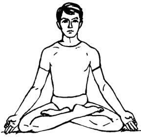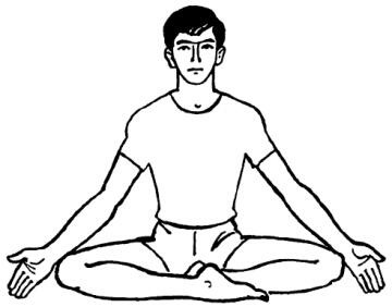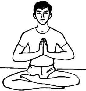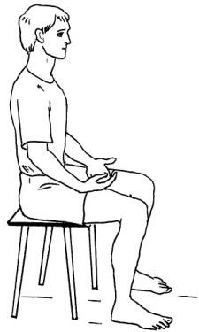 Перед началом выполнения комплекса необходимо настроить себя на занятие успокоить ум, дыхание, сосредоточиться на ощущении тела. Для такой настройки традиционно принято использовать определенные позы (асаны), способствующие глубокому сосредоточению. В зависимости от предпочтения и физических возможностей занимающегося ими могут быть «поза ученика» сидя на пятках ваджрасана (рис. 5), поза со скрещенными ногами сукхасана (рис. 6) или более сложные варианты позы лотоса ардхападмасана и падмасана (рис. 7), в которых одна или обе ступни кладутся на бедро противоположной ноги. При невозможности выполнения ни одной из этих асан можно просто сесть на стул, выпрямить спину (рис. 8) и посидеть примерно одну две минуты с закрытыми глазами. Руки можно положить на бедра или соединить перед грудью в жесте намасте жесте молитвы и медитации (рис. 9).