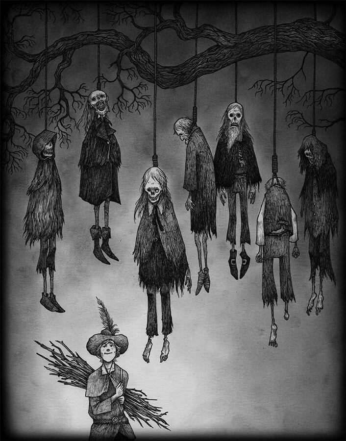 Бояться, повторил возница, почесывая затылок. Хоть и чудно́е желание, да ладно, я его с легкостью исполню. Видишь вон то дерево? он указал трубкой на большое дерево чуть поодаль. С его веток что-то свисало, но что именно, издали было не разобрать. На нем болтаются семь висельников. Разбойники, убийцы и того хуже. Устройся под ним и дождись ночи. Вот тогда твое забавное желание исполнится. А я приеду завтра за деньгами.