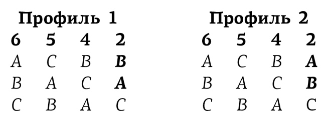 Рассмотрим представленный на рис. 1.1 численный пример с тремя кандидатами A, B и C. Первый профиль демонстрирует ситуацию до дебатов. Пусть шесть миллионов избирателей считают A наилучшим кандидатом, B приемлемым, а C наихудшим, пять миллионов, напротив, говорят, что C > A > B, выбор четырех миллионов имеет вид B > C > A, а последние два миллиона имеют предпочтения B > A > C. Во второй тур выходят кандидаты A и B, набравшие по шесть миллионов голосов, где с почти двукратным отрывом побеждает кандидат A, являющийся меньшим из зол для пяти миллионов приверженцев C.