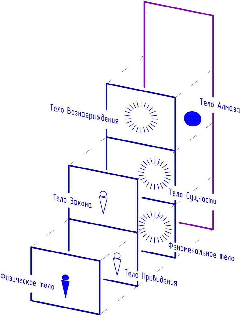 (нирманакая) связано с манипура чакрой. Действует в нижнем каузале. Может проявить себя в мире явлений как привидение, отделённое от реального физического тела.