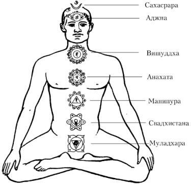 Вдоль позвоночника, согласно представлениям йоги, располагаются 7 главных психоэнергетических центров, чакр (рис. 1), посредством которых различные аспекты человеческого сознания проявляются в нашем мире. Западная наука соотносит чакры с нервными сплетениями организма, однако это сопоставление не вполне точно. Каждой чакре соответствует свое особенное психическое восприятие мира, свой элемент, энергия (прана), свои характерные ощущения, эмоции и чувства.