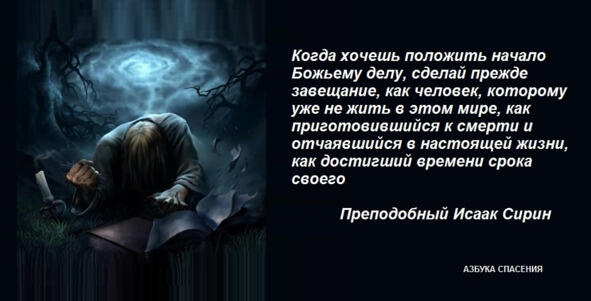 Когда хочешь положить начало Божьему делу, сделай прежде завещание, как человек, которому уже не жить в этом мире, как приготовившийся к смерти и отчаявшийся в настоящей жизни, как достигший времени срока своего. И действительно имей это в мысли, чтобы надежда продлить настоящую жизнь не воспрепятствовала тебе подвизаться и победить, потому что надежда продлить сию жизнь расслабляет ум. Посему отнюдь не умудряйся (т.е. живи не только умом, но и верою) до излишества, но вере дай место в уме своем; содержи в памяти многие дни будущие и неисповедимые века после смерти и суда, и да не придет на тебя некогда расслабление, по словам Премудрого, что тысяча лет нынешнего века не равняется и одному дню в веке праведных (Пс.89:5).