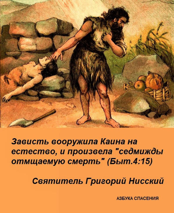 Зависть это начало зловредных страстей, отец смерти, первая дверь греху, корень порока, порождение печали, матерь бедствий, повод к непокорности, начало стыда. Зависть изгнала нас из рая, став змием пред Евою, зависть преградила доступ к древу жизни и, совлекши с нас священные одежды, по причине стыда привела к ветвям смоковницы. Зависть вооружила Каина на естество, и произвела седмижды отмщаемую смерть (Быт.4:15).