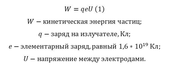 При расчёте (1), важно также учитывать фактор наличия количества заряда в одной частице, к примеру, если у электрона имеется всего один элементарный заряд, то у альфа-частицы или ядра гелия их 2, а у иона алюминия 13, данное число умножается на общий заряд, откуда и получается общая кинетическая энергия.