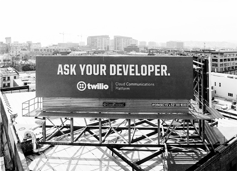 В начале 2015 г. компания Twilio арендовала билборд в Сан-Франциско рядом с Шоссе 101. Билборды технологических компаний давно стали частью ландшафта в районе залива точно так же, как билборды с рекламой фильмов в Лос-Анджелесе. С одной стороны, это повышает узнаваемость бренда, а с другой является элементом тактики рекрутинга, способом обратить на компанию внимание тысяч инженеров, едущих на работу. Кроме того, в этом есть что-то от стремления показать свое превосходство, поскольку всем нам хочется придумать что-то незаурядное вроде популярной шутки или чего-нибудь такого, что понимают только в Кремниевой долине.