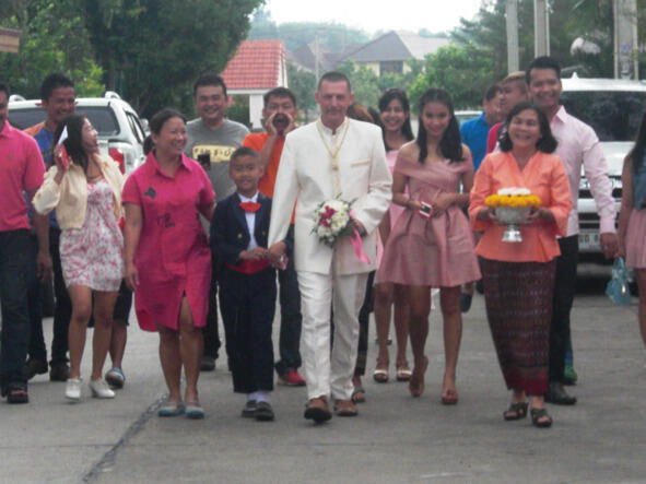 Перед полуднем все на старте. Жених должен прийти в дом невесты со своими друзьями. Функцию друзей взяли на себя часть моих новых родственников, друзья по университету и друзья семьи. Мы уходим на дальний конец посёлка и в 12 часов пополудни двигаемся в сторону дома с криками и шумом. Крики и улюлюканье друзей жениха в Таиланде совершенно особые, свадебные. Всё происходит очень громко и весело, вся округа слышит начало свадьбы. Родственники и близкие друзья в розовых платьях и рубашках таков дресскод, приличествующий событию. Перед самой цветочной аркой нашу процессию останавливают друзья невесты. Нужно пройти «трое ворот», это своеобразный выкуп, цветочные ворота, серебряные и золотые. Приходится платить каждому участнику «препятствия» чисто символически. Сейчас уже не припомню, но около 100 батт. Атрибуты ворот натуральные, и цветы, и серебро, и золотые цепочки. Перед входом в дом самый младший член семьи протирает жениху обувь тряпочкой. За это он тоже получает вознаграждение, на этом процесс «выкупа невесты» завершён. Я зашёл в дом и обнял разукрашенную невесту, которая потрясающе красива в национальном платье и со специфическим макияжем.