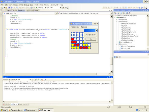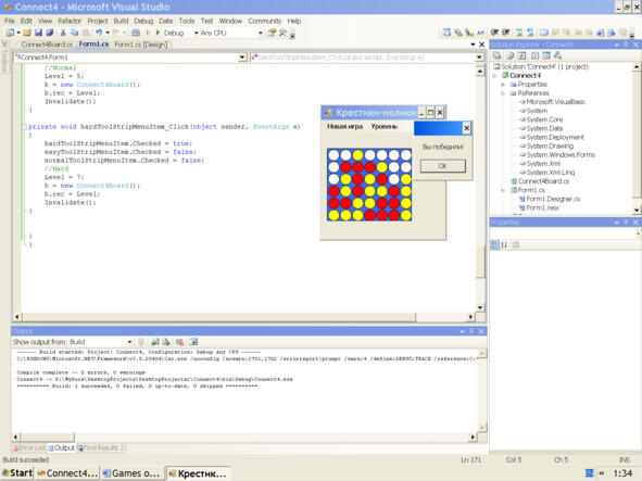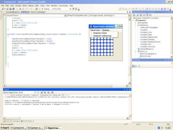 Так по очереди игрок и компьютер выделяют жёлтые и красные кружочки, стараясь первым выделить горизонтальную, вертикальную или диагональную линию из 4-х кружочков одинакового цвета. После каждого щелчка игроком поля игры (мышью) он слышит сигнал Beep (по-русски: Бип).