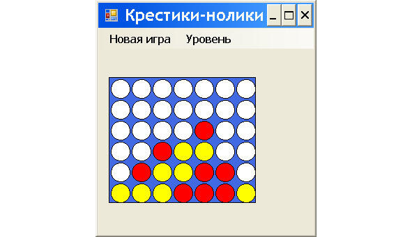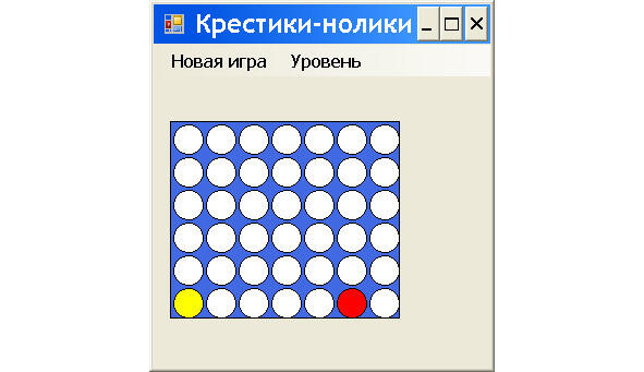1. После запуска игры на форме появляется поле игры, состоящее из 7 x 6 белых кружочков (рис. 12.1). Напомним, что цифры соответствуют количеству квадратов по осям «x» и «y». В меню «Новая игра» по умолчанию установлен режим «Начинает игрок», но можно выбрать «Начинает компьютер» (рис. 12.1). В меню Уровень по умолчанию установлен режим Обычный, но можно выбрать Нормальный или Сложный (рис. 12.2).