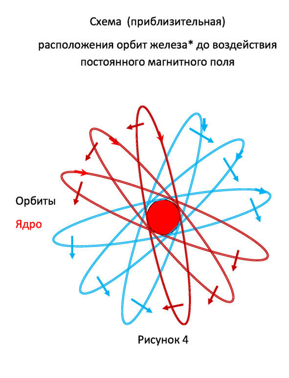Рассмотрим атом ферромагнетика. Орбиты расположены по всей сфере ядра. Магнитные поля, образованные движением электронов по орбитам, взаимодействует между собой, создавая внутреннее замкнутое поле атома. Атом не образует внешнего магнитного поля.