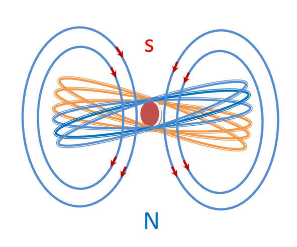 Теперь все магнитные вектора электронов направлены в противоположную сторону, навстречу потоку постоянного магнита. Под действием этого поля орбиты сначала вернутся в положение, показанному на рисунке 4, затем их разворот продолжится до положения указанному на рисунке 6.