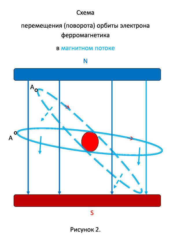 Теперь вектор магнитного поля электрона будет направлен навстречу внешнему магнитному полю. Подчиняясь более сильному магнитному потоку, вектор поля электрона начнет встраиваться в новое направление магнитного потока. Начинается перемагничивание ферромагнетика. В какой-то момент ферромагнетик потеряет внешние магнитные свойства. То есть, он размагнитится. Орбита электрона вернется в прежнее положение. (Изображена пунктиром). При дальнейшем воздействии внешнего магнитного поля, она продолжит разворот до тех пор, пока их вектора станут близкими по направлению и магнитные поля объединятся. Смотри рисунок 3.