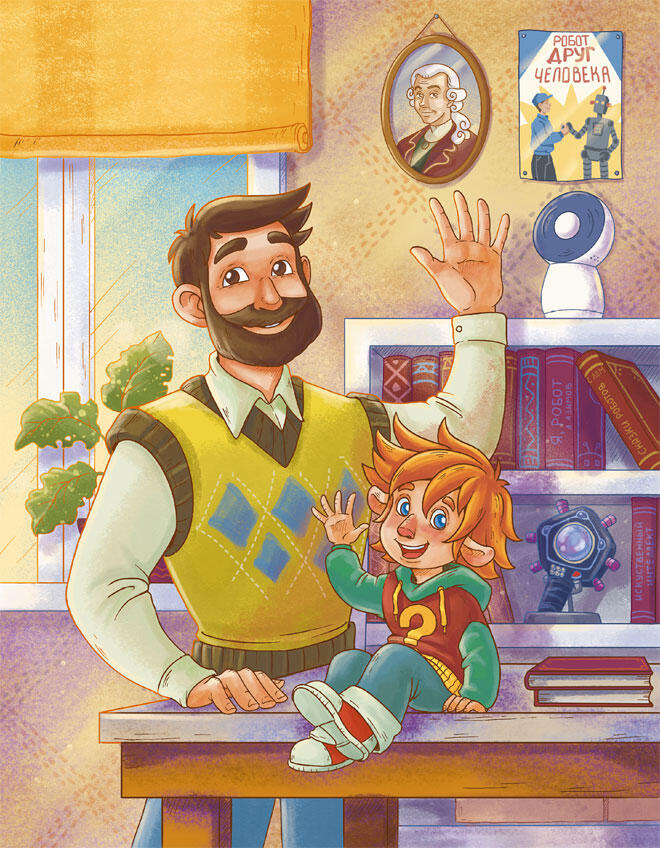 Здравствуйте, ребята! Меня зовут Чевостик. Я живу на книжной полке в библиотеке у дяди Кузи. Не удивляйтесь: я небольшого роста, а нижняя полка в книжном шкафу дяди Кузи очень высокая и просторная, поэтому мне на ней хорошо и удобно. Какой я? Похож на обыкновенного мальчишку, волосы рыжие, характер весёлый. Дядя Кузя в шутку зовёт меня Чевочкой с хвостиком. Но никакого хвоста у меня нет, зато есть ушки на макушке. Больше всего на свете я люблю узнавать новое, поэтому всё время задаю всякие вопросы дяде Кузе. О чём бы я ни спросил, он всё знает и мне рассказывает. Это потому, что дядя Кузя очень умный. Он прочитал много-много разных книг. А ещё мы с ним любим путешествовать! С собой мы берём разные устройства. Например, у меня в рюкзачке всегда лежат быстролики. Они похожи на обычные роликовые коньки, и с их помощью можно легко и быстро преодолевать небольшие расстояния. Если же надо перемещаться во времени и на очень большие расстояния, нам помогает времяскок. Это такой прибор, его дядя Кузя изобрёл. Набираешь на времяскоке место и время, куда хочешь попасть, раз, два и уже там! Сегодня мы наверняка тоже куда-нибудь отправимся!