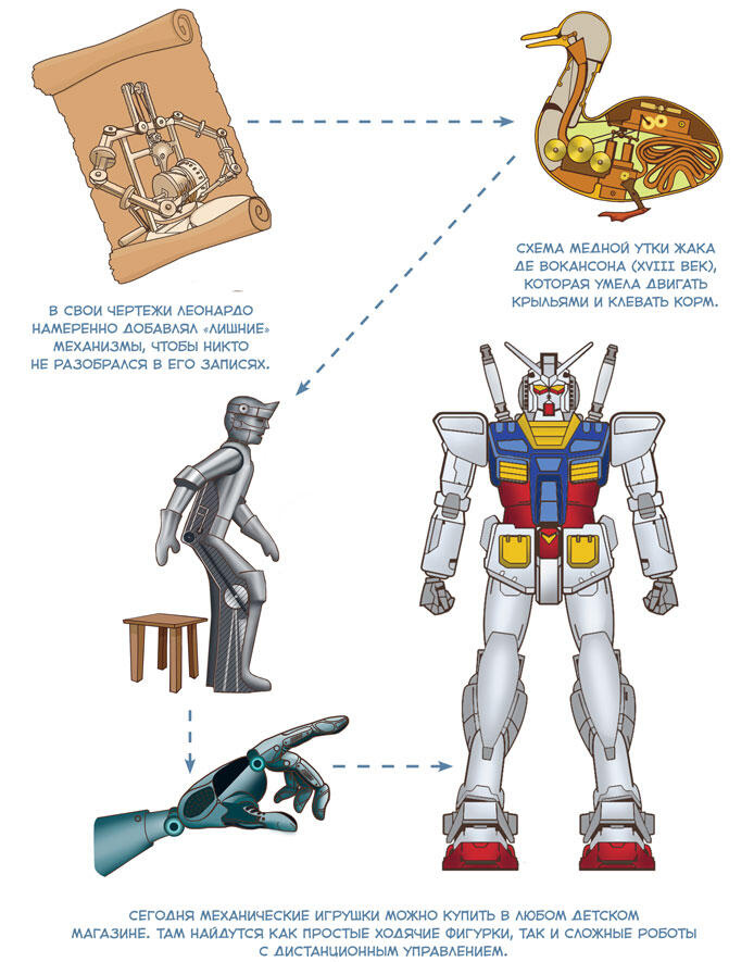 Первые упоминания о попытках создать подобные механизмы появились очень давно. Предшественниками роботов можно считать игрушки. Чертёж одной из них механического рыцаря, который мог двигать руками и ногами и поднимать забрало шлема, нашли в бумагах Леонардо да Винчи. Неизвестно, построил ли знаменитый изобретатель такого рыцаря или он остался только на чертеже. А вот более поздние заводные механизмы в виде фигурок людей и животных сохранились. Искусные мастера изготовляли такие механизмы в XVII и XVIII веках. Тогда их называли автоматонами.