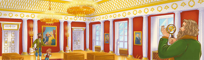 Где это мы? Комната такая большая, с громадными окнами, с высоким разрисованным потолком. А где же автоматон? Что это за ящики расставлены по всей комнате? О, один уже открыт, надо заглянуть.