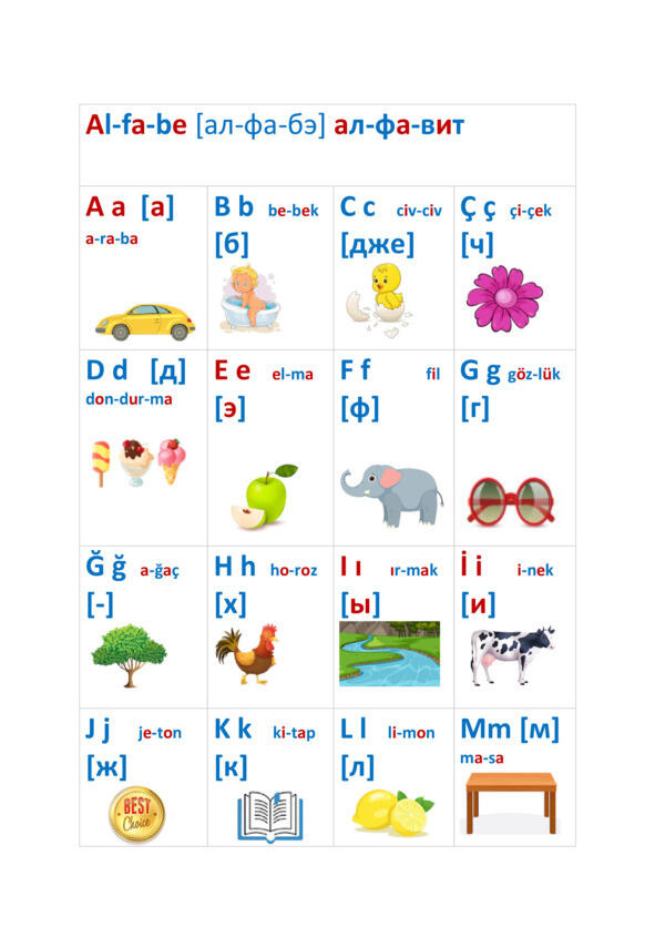 Данный букварь рассчитан на детей, которые уже умеют читать по-русски, и приступают к изучению турецкого языка. Он может быть использован для занятий с ребёнком или группой детей дома и в детских учреждениях. Книга научит ребёнка читать, считать и писать по-турецки. Учебник может быть использован для подготовки ребёнка или группы детей к турецкой школе.