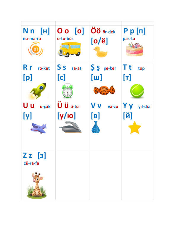 За-да-ни-е 1. Про-чи-тай бук-ву и сло-во (в ту-рец-ком сло-ве у-да-ре-ни-е па-да-ет на пос-лед-ний слог):
