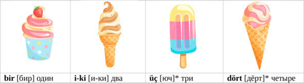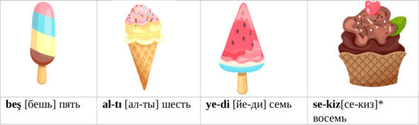 beş don-dur-ma [бэш дон-дур-ма] (beş don-dur-ma) пять мо-ро-же-ных