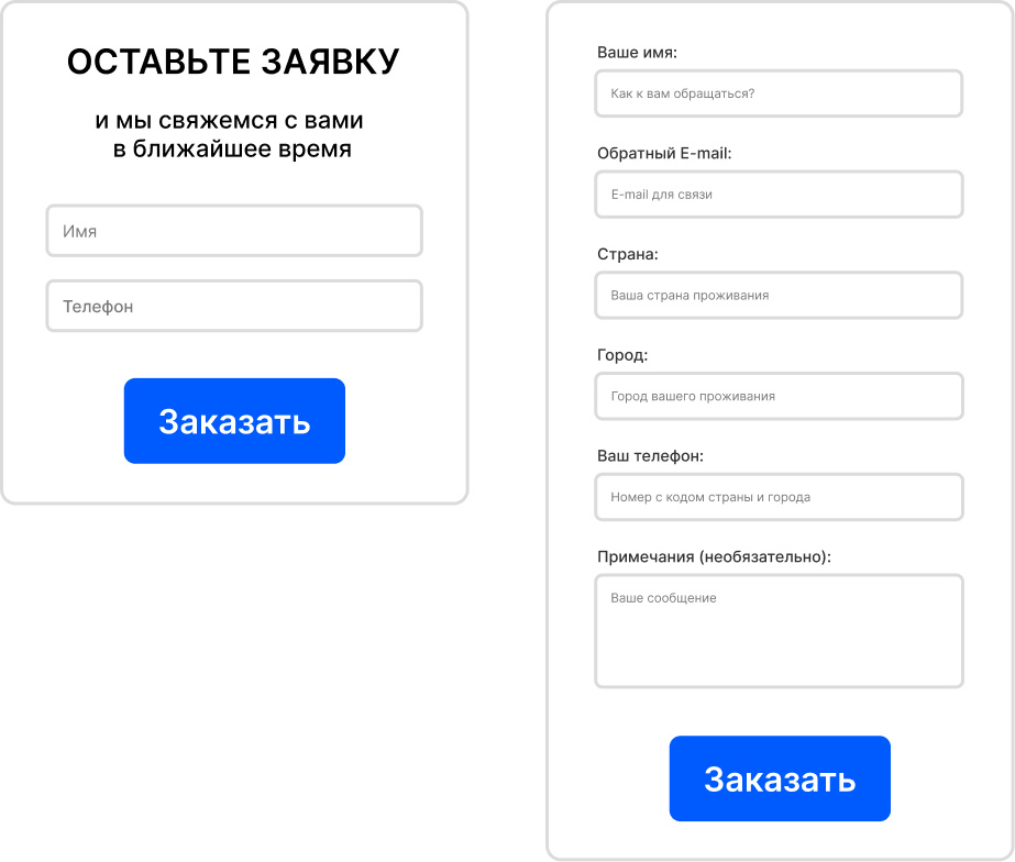 Они бывают длинные и короткие. В коротких у человека берут только имя и телефон, а иногда даже просто телефон. Длинные формы могут содержать несколько полей, включая адрес и индекс.