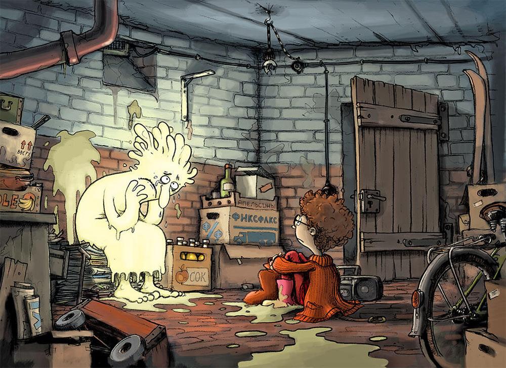 Какуе та-а-ам! Привидение шмыгало носом. И вдруг на миг, рассердившись, опять приобрело противный оттенок плесени. Думаешь, мне шибку нравится жить в этуй мрачнуй кладувке пудвала третьего класса? Но, эх, привидение снова захлюпало носом, что ж мне ещё устаёт-си-и-и?