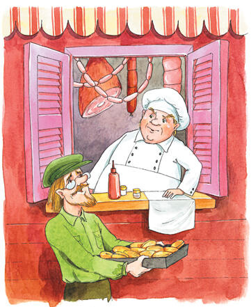 На следующее утро Урвар собрался в дорогу. Он забрал с собой все колбаски из кладовки и положил их в фургон. Потом покатил тяжёлую повозку к церкви вверх по крутому склону, задыхаясь, пыхтя и потея. Ему казалось, что с каждым метром фургончик становится тяжелее, а подъём круче.