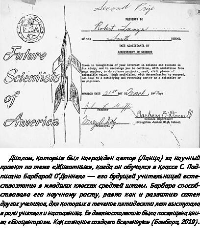 Диплом, которым был награжден автор (Ланца) за научный проект по теме «Животные», когда он обучался в классе С. Подписано Барбарой ОДоннелл его будущей учительницей естествознания в младших классах средней школы. Барбара способствовала его научному росту, равно как и развитию сотен других учеников, для которых в течение пятидесяти лет выступала в роли учителя и наставника. Ее девяностолетию была посвящена книга «Биоцентризм. Как сознание создает Вселенную» (Бомбора, 2019).