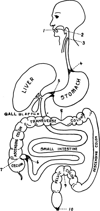 1. Рот 2. Глотка 3. Вход в пищевод 4. Кардиальное отверстие желудка 5. Пилорус 6. Илеоцекальный сфинктер 7. Илеоцекальный клапан 8. Узел Кита, место обратной перистальтики 9. Тазовая кишка 10. Анус.